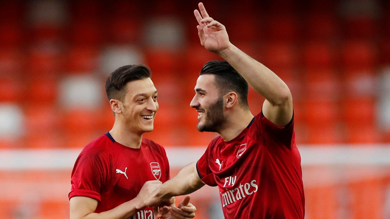 Soccer Football - Europa League Semi Final Second Leg - Valencia v Arsenal - Mestalla, Valencia, Spain - May 9, 2019 Arsenal's Mesut Ozil and Sead Kolasinac during the warm up before the match Action Images via Reuters/Andrew Boyers - RC1205265280