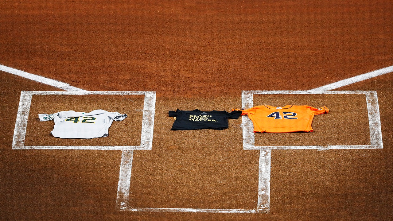 The Athletics and Astros placed a No. 42 jersey in each batter’s box. Houston starters took their positions, with other players on both sides lining up in front of their dugouts.
