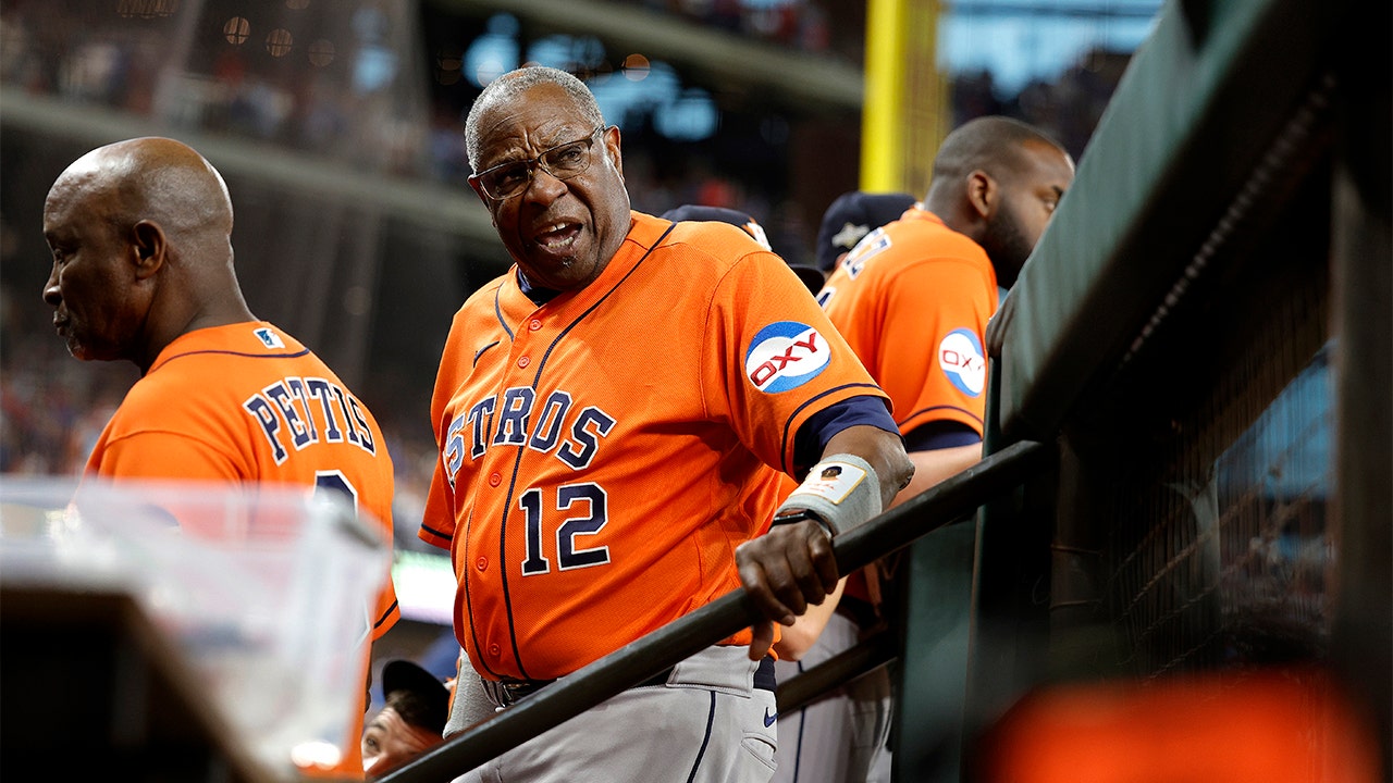 Manger Dusty Baker, #12 of the Houston Astros, argues with the umpires after Bryan Abreu, #52, was ejected from the game against the Texas Rangers during the eighth inning in Game Five of the American League Championship Series at Globe Life Field on October 20, 2023, in Arlington, Texas. (Stacy Revere/Getty Images)