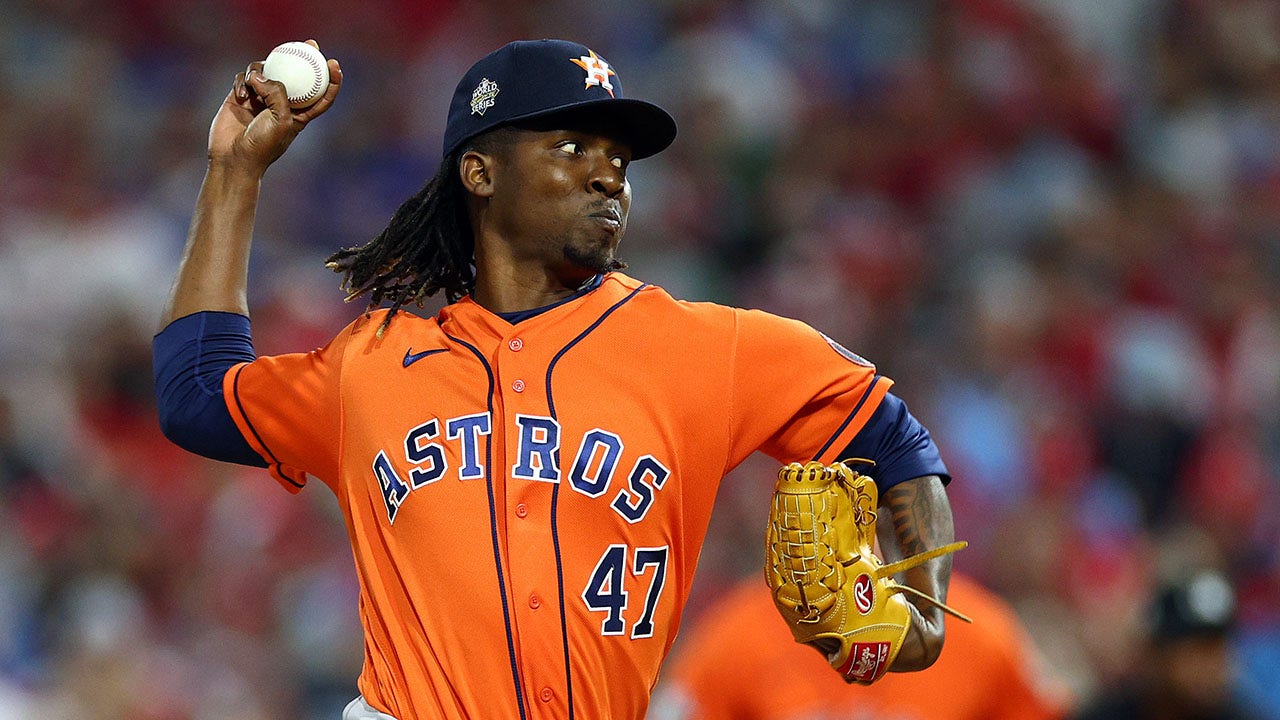 Rafael Montero of the Houston Astros delivers a pitch against the Philadelphia Phillies during the eighth inning in Game 5 of the 2022 World Series at Citizens Bank Park Nov. 3, 2022, in Philadelphia. (Elsa/Getty Images)