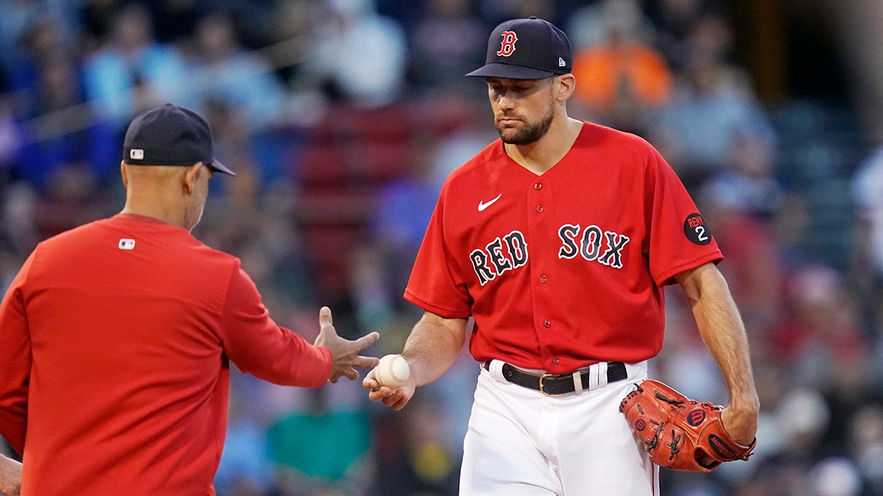 Boston Red Sox starting pitcher Nathan Eovaldi, right, hands the ball to manager Alex Cora during the second inning of the team's baseball game against the Houston Astros at Fenway Park, Tuesday, May 17, 2022, in Boston. Eovaldi allowed nine runs, six earned, in the second inning. (AP Photo/Charles Krupa)