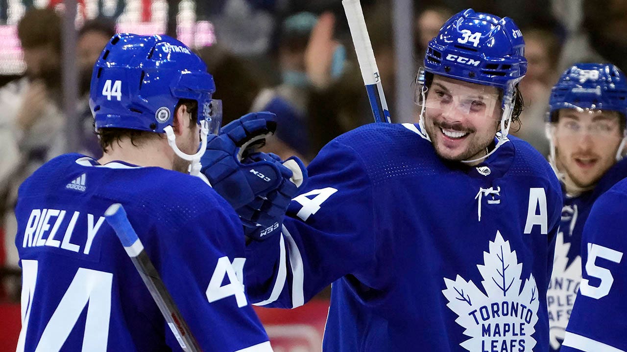 Toronto Maple Leafs forward Auston Matthews (34) celebrates his hat trick with teammate Morgan Rielly (44) during the third period of an NHL hockey game against the Seattle Kraken, Tuesday, March 8, 2022, in Toronto. (Nathan Denette/The Canadian Press via AP)
