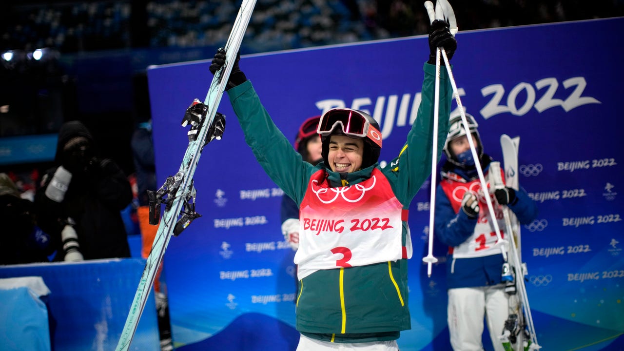 Australia's Jakara Anthony celebrates after winning the gold medal for the women's moguls finals at Genting Snow Park at the 2022 Winter Olympics, Sunday, Feb. 6, 2022, in Zhangjiakou, China. (AP Photo/Francisco Seco)