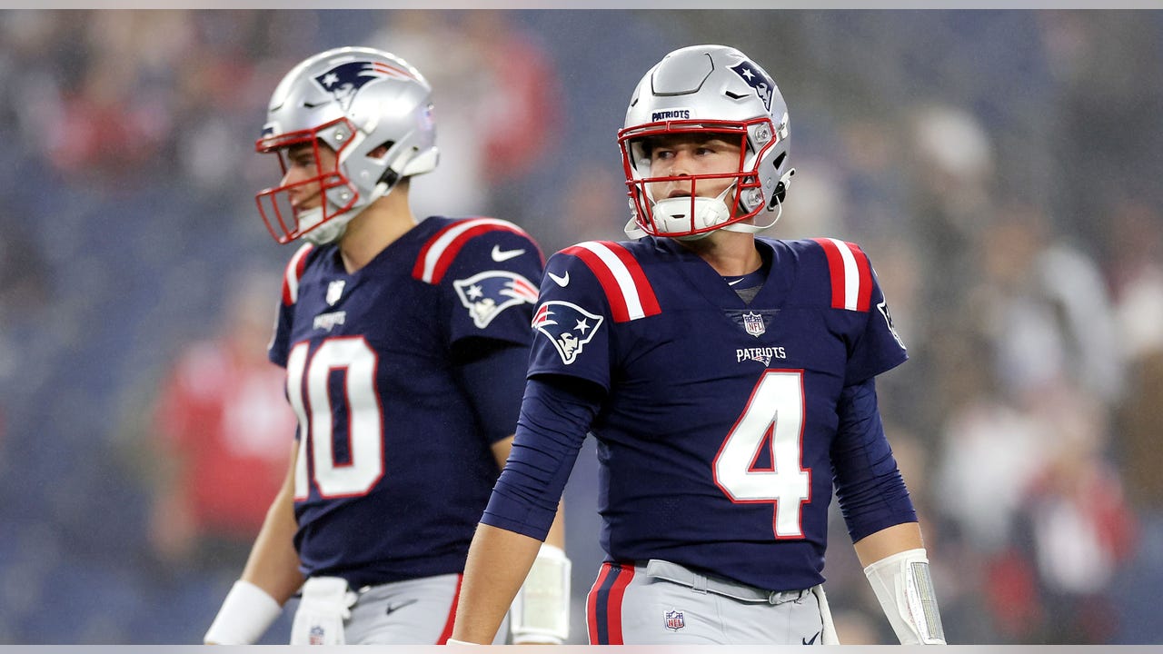 Mac Jones #10 and Bailey Zappe #4 of the New England Patriots stand on the field prior to the game against the Chicago Bears at Gillette Stadium on October 24, 2022 in Foxborough, Massachusetts. (Maddie Meyer/Getty Images)