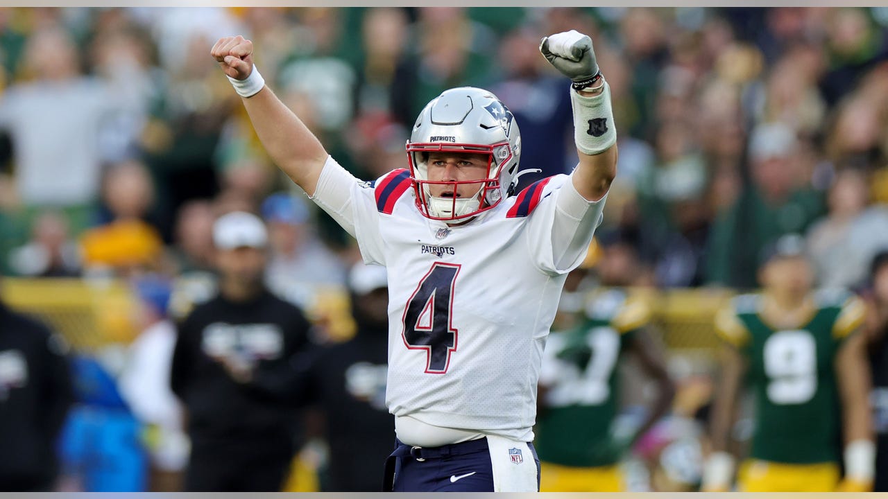 Bailey Zappe of the New England Patriots reacts to a touchdown during the fourth quarter against the Green Bay Packers at Lambeau Field on Oct. 2, 2022, in Green Bay, Wisconsin. (Stacy Revere/Getty Images)