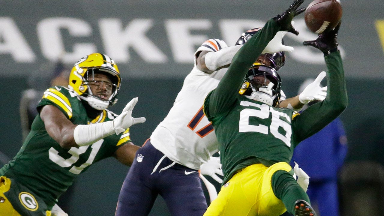 Green Bay Packers' Darnell Savage intercepts a pass in front of Chicago Bears' Anthony Miller during the second half of an NFL football game Sunday, Nov. 29, 2020, in Green Bay, Wis. (AP Photo/Mike Roemer)