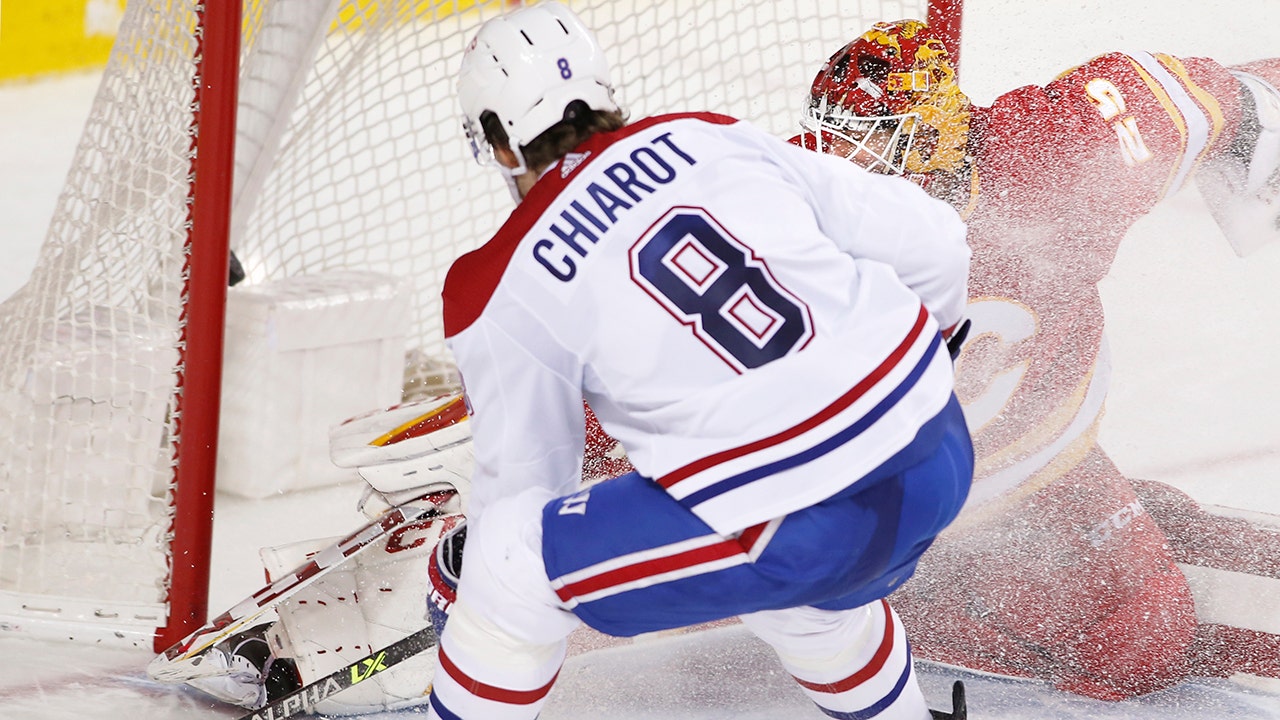 Montreal Canadiens defenseman Ben Chiarot scores in overtime against Calgary Flames goalie Jacob Markstron during an NHL hockey game Thursday, March 3, 2022, in Calgary, Alberta. (Larry MacDougal/The Canadian Press via AP)
