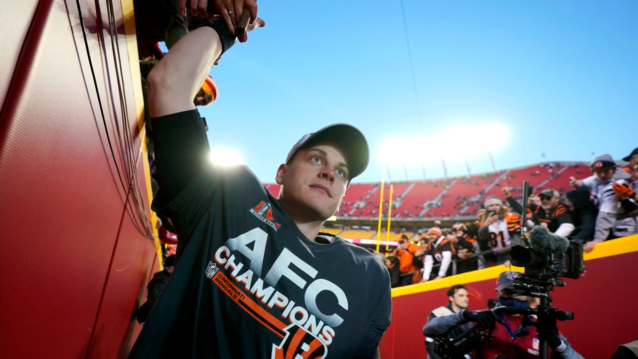 Cincinnati Bengals quarterback Joe Burrow celebrates with fans after the AFC championship NFL football game against the Kansas City Chiefs, Sunday, Jan. 30, 2022, in Kansas City, Mo. The Bengals won 27-24 in overtime. (AP Photo/Paul Sancya)