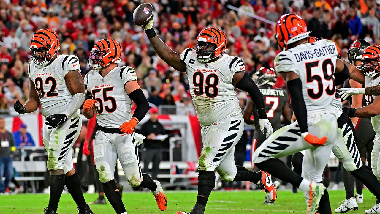 DJ Reader #98 of the Cincinnati Bengals celebrates a fumble recovery during the third quarter in the game against the Tampa Bay Buccaneers at Raymond James Stadium on December 18, 2022 in Tampa, Florida. (Julio Aguilar/Getty Images)