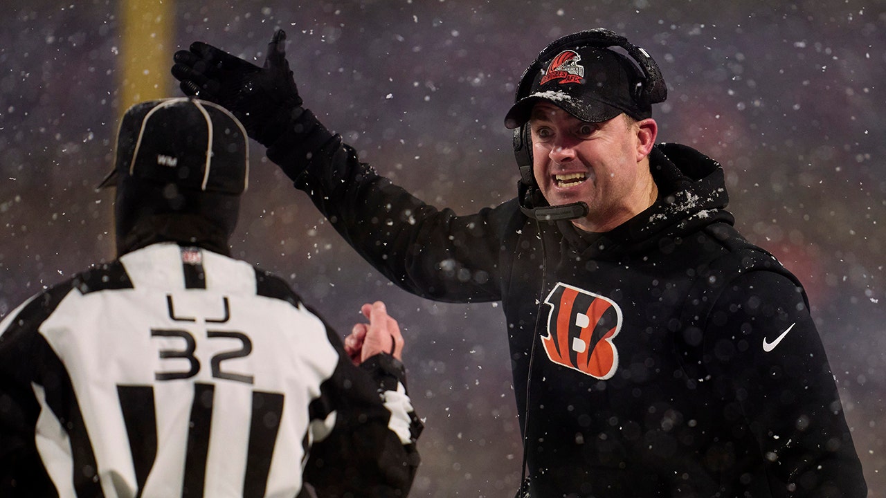 Cincinnati Bengals head coach Zac Taylor reacts to line judge Jeff Bergman during the division round playoff game against the Buffalo Bills, Sunday, Jan. 22, 2023, in Orchard Park, New York. (AP Photo/Joshua Bessex)