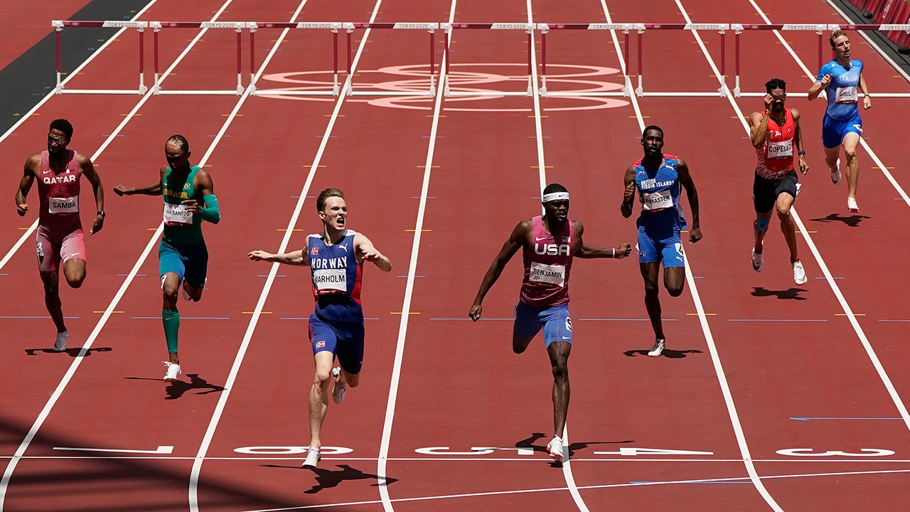 Covering the distance between the barriers 13 powerful steps at a time, Warholm never came close to breaking stride. At the eighth hurdle, Benjamin was about a body length behind and seemed to be closing. But in the homestretch, Warholm pulled away. He sped through the finish with arms-a-flailing.