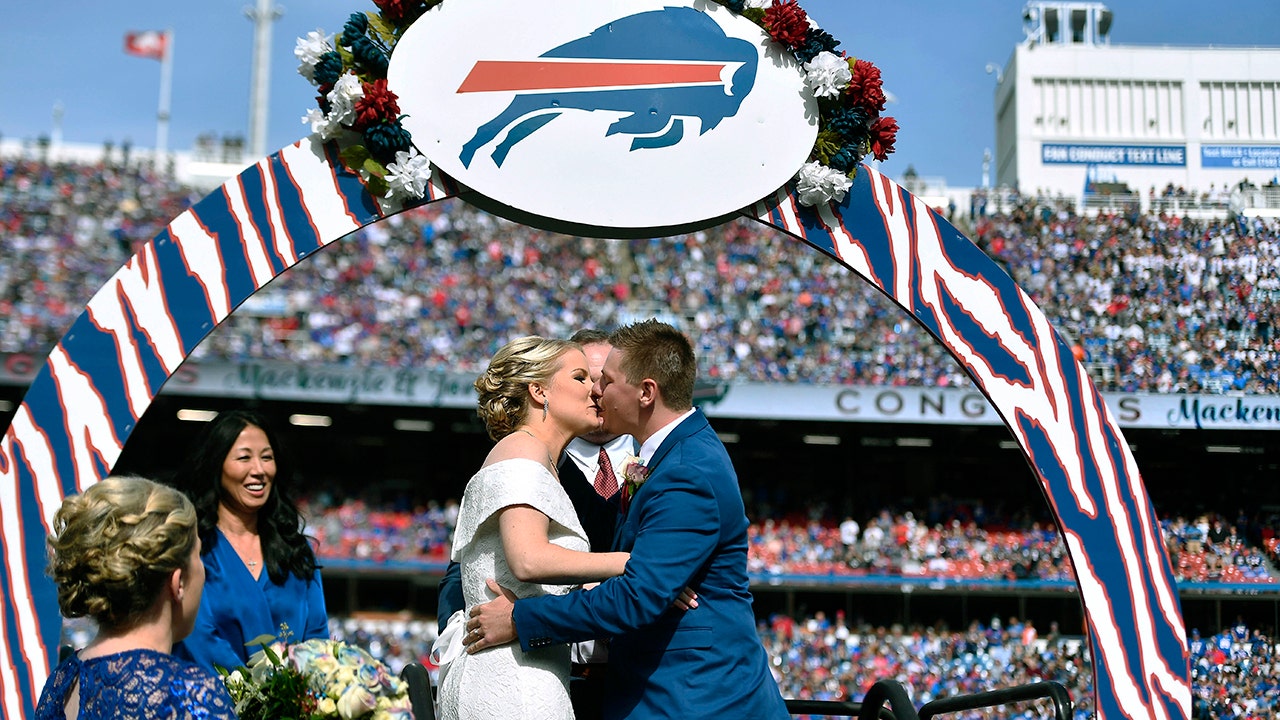 Two Buffalo Bills fans tied the knot during their favorite team’s game against the New England Patriots on Sunday.