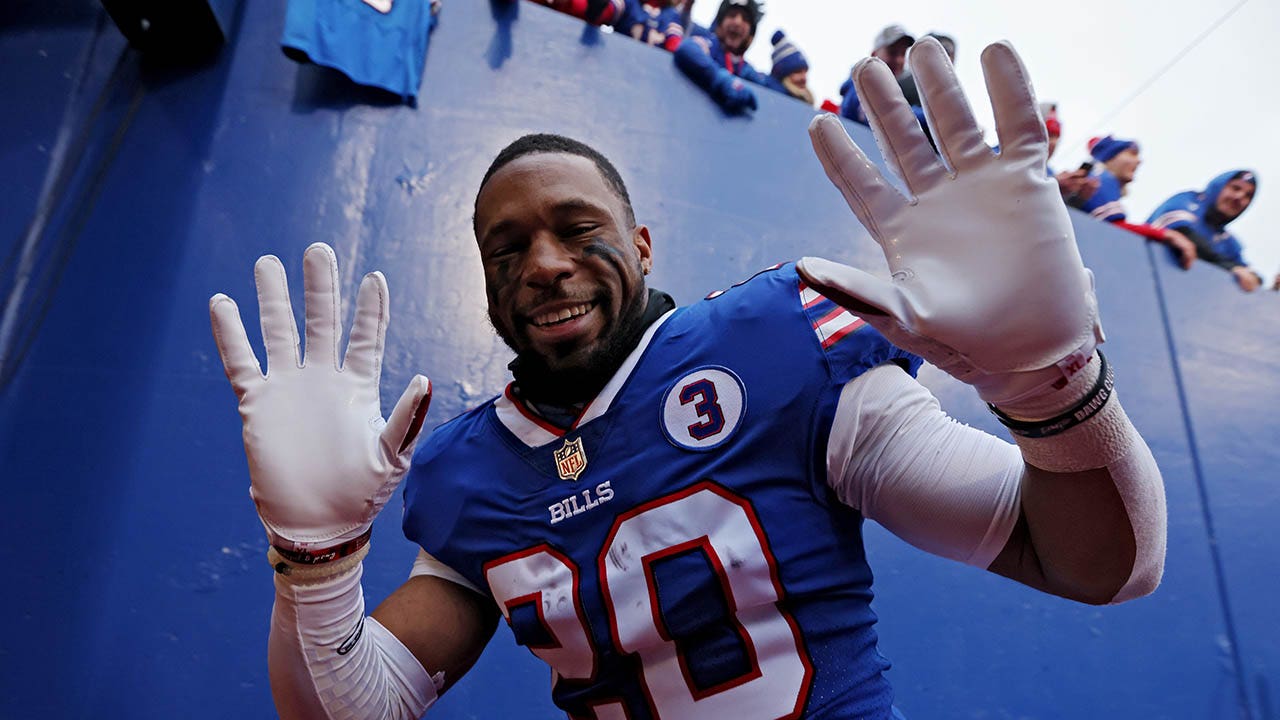 Nyheim Hines of the Bills celebrates after Buffalo's 35-23 win against the New England Patriots at Highmark Stadium on Jan. 8, 2023, in Orchard Park, New York. (Bryan M. Bennett/Getty Images)