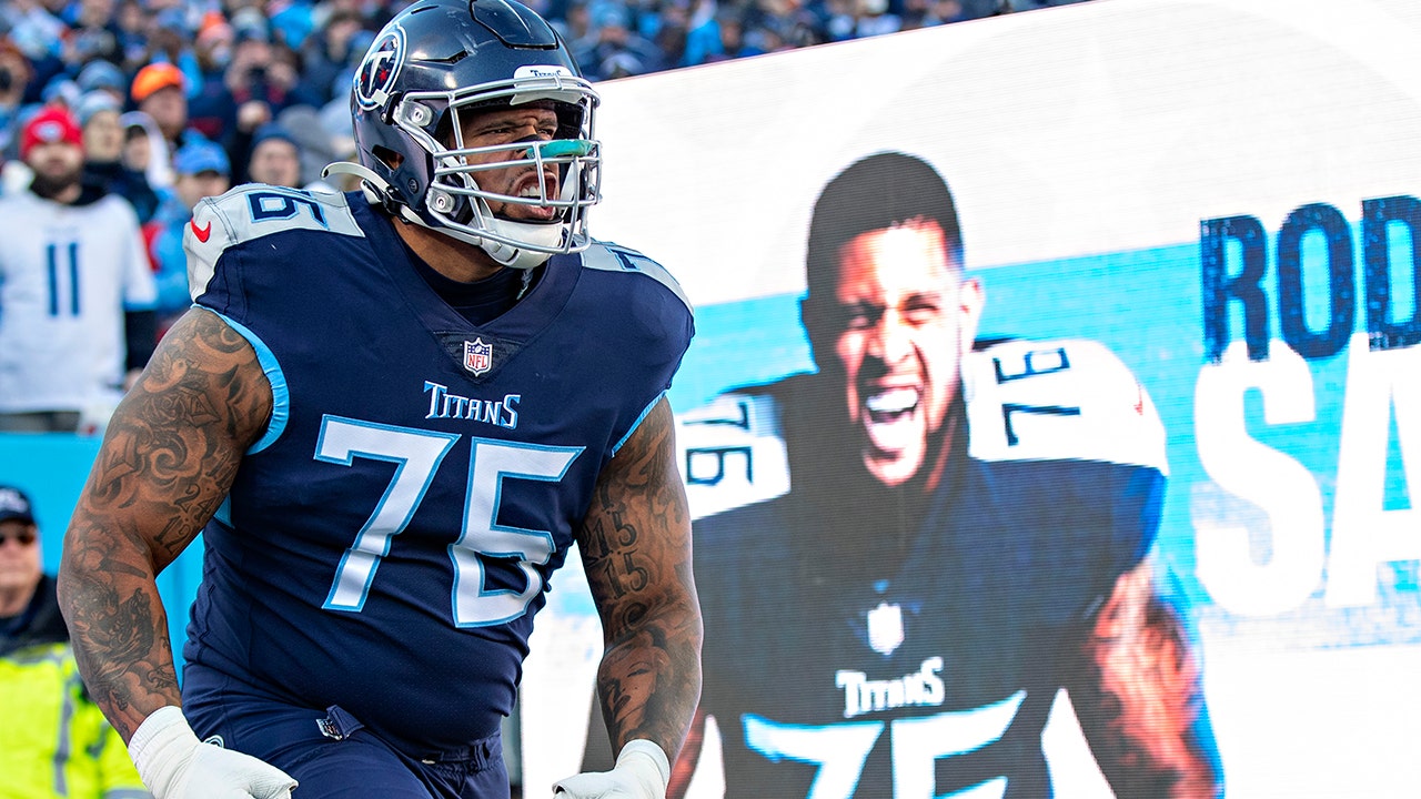 Rodger Saffold III of the Tennessee Titans runs onto the field during introductions before a game against the Cincinnati Bengals in an AFC divisional playoff game at Nissan Stadium Jan. 22, 2022, in Nashville. (Wesley Hitt/Getty Images)