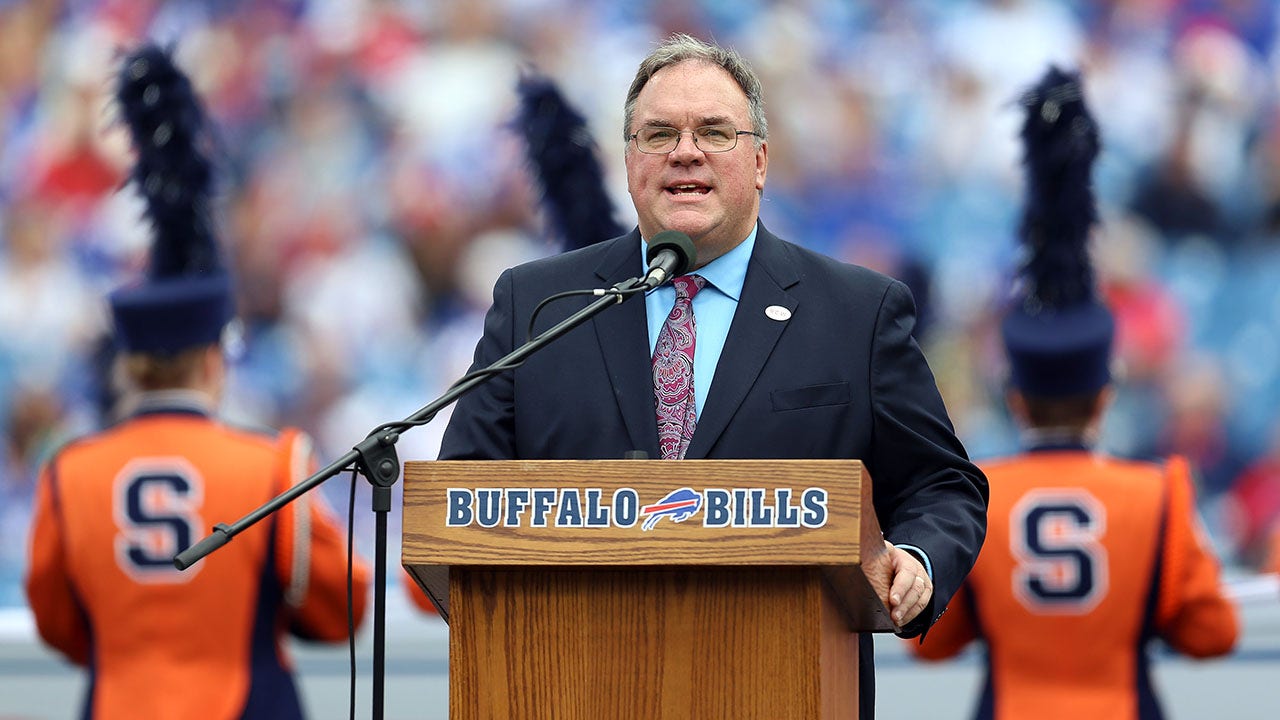 John Murphy, the voice of the Bills, speaks to the crowd before a game between the Buffalo Bills and the Miami Dolphins at Ralph Wilson Stadium Sept. 14, 2014, in Orchard Park, N.Y. (Vaughn Ridley/Getty Images)