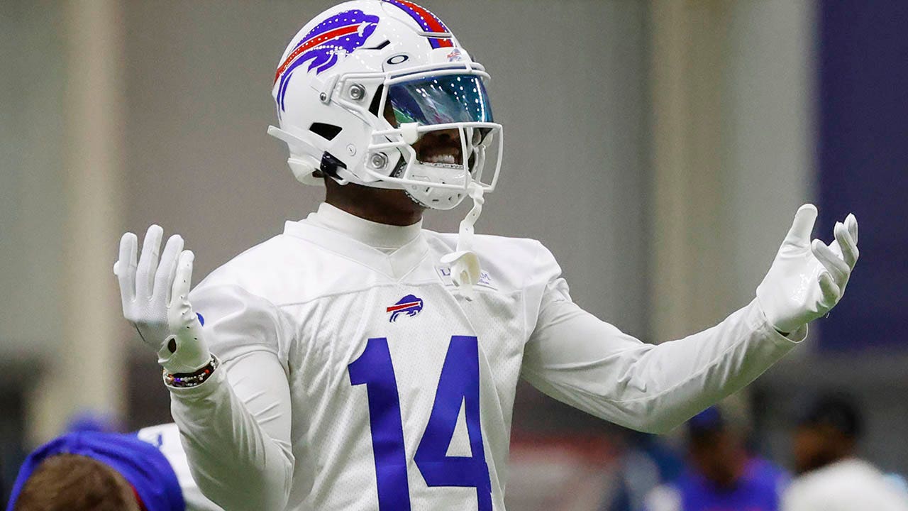 Buffalo Bills wide receiver Stefon Diggs, #14, reacts during NFL football practice in Orchard Park, New York, Wednesday, June 14, 2023. (AP Photo/Jeffrey T. Barnes)