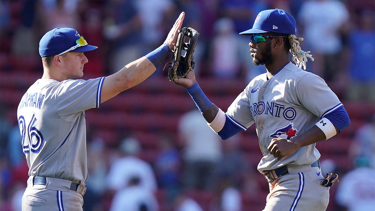 Toronto Blue Jays' Matt Chapman, left, celebrates with Raimel Tapia, right, after defeating the Boston Red Sox in a baseball game, Sunday, July 24, 2022, in Boston. (AP Photo/Steven Senne)