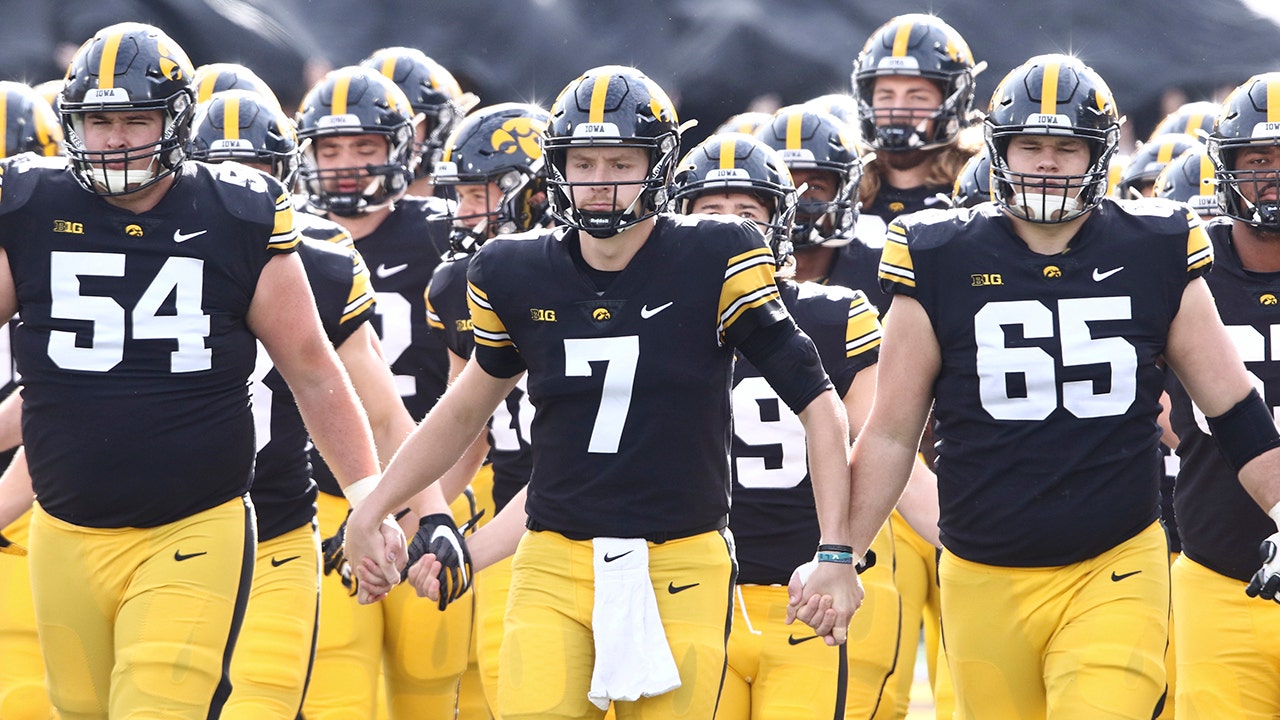 IOWA CITY, IOWA- NOVEMBER 20: Quarterback Spencer Petras #7, offensive lineman Matt Fagan #54 and offensive lineman Tyler Linderbaum #65 of the Iowa Hawkeyes walksout with teammates before the match-up against the Illinois Fighting Illini at Kinnick Stadium on November 20, 2021 in Iowa City, Iowa. (Matthew Holst/Getty Images)