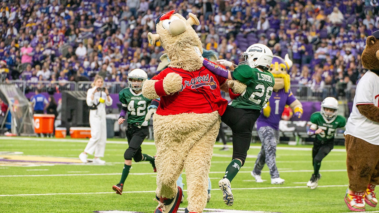 Atlanta Braves mascot Blooper stiff arms a kid football player during the halftime of the NFL game between the Indianapolis Colts and Minnesota Vikings on Dec. 17, 2022, at U.S. Bank Stadium in Minneapolis. (Bailey Hillesheim/Icon Sportswire via Getty Images)
