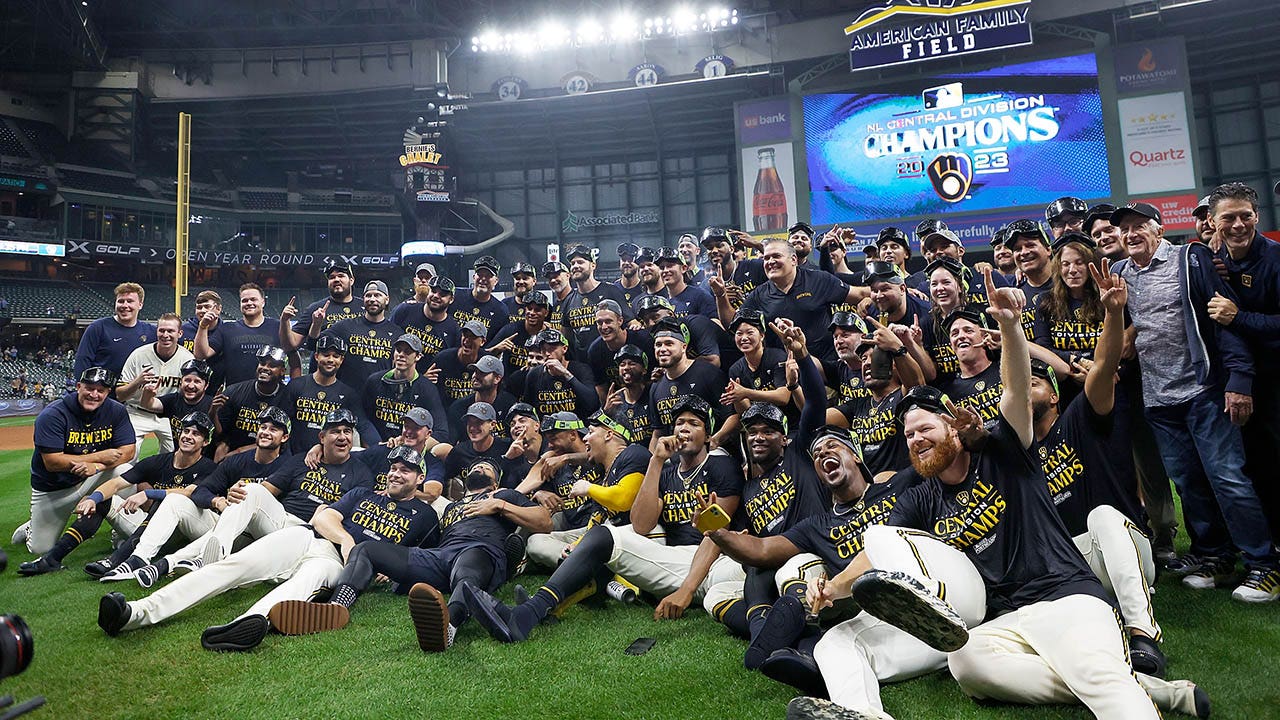 Milwaukee Brewers players pose for a team photo after winning the National League Central Division at American Family Field Sept. 26, 2023, in Milwaukee. (John Fisher/Getty Images)
