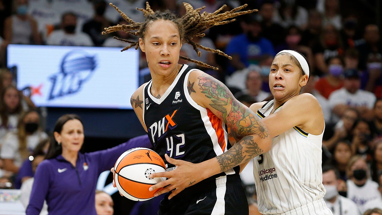 Phoenix Mercury center Brittney Griner, #42, drives past Chicago Sky forward Candace Parker, #3, during the first half of Game 1 of the WNBA Basketball Finals, Sunday, Oct. 10, 2021, in Phoenix. (AP Photo/Ralph Freso, File)