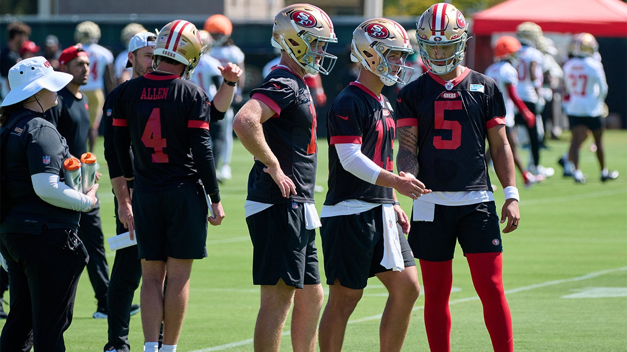 San Francisco 49ers quarterbacks Brock Purdy, Trey Lance and Sam Darnold during training camp on July 27, 2023, in Santa Clara, California. (Robert Edwards-USA Today Sports)