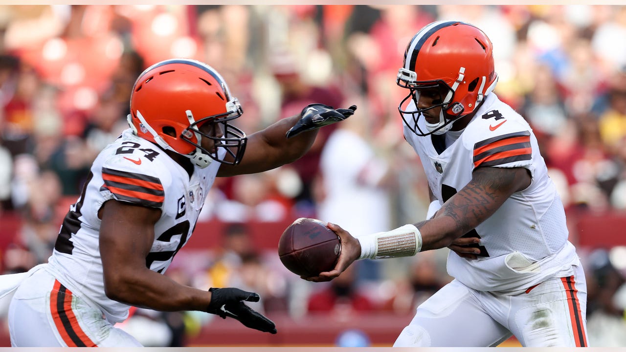 Deshaun Watson #4 of the Cleveland Browns hands the ball off to Nick Chubb #24 of the Cleveland Browns during the third quarter against the Washington Commanders at FedExField on January 01, 2023 in Landover, Maryland. (Todd Olszewski/Getty Images)