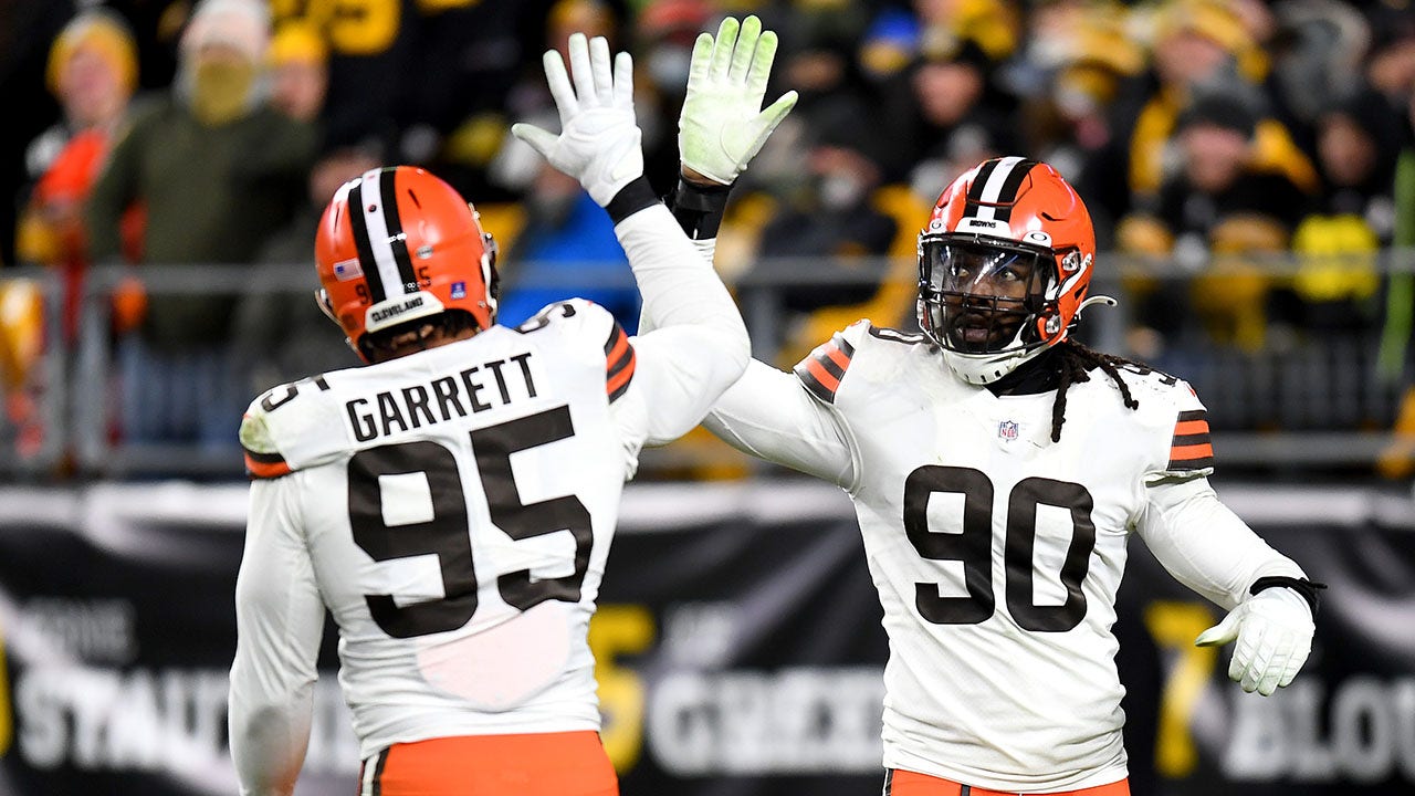 Myles Garrett, #95 of the Cleveland Browns, high-fives teammate Jadeveon Clowney, #90, in the third quarter against the Pittsburgh Steelers at Heinz Field on January 3, 2022, in Pittsburgh, Pennsylvania. (Joe Sargent/Getty Images.)
