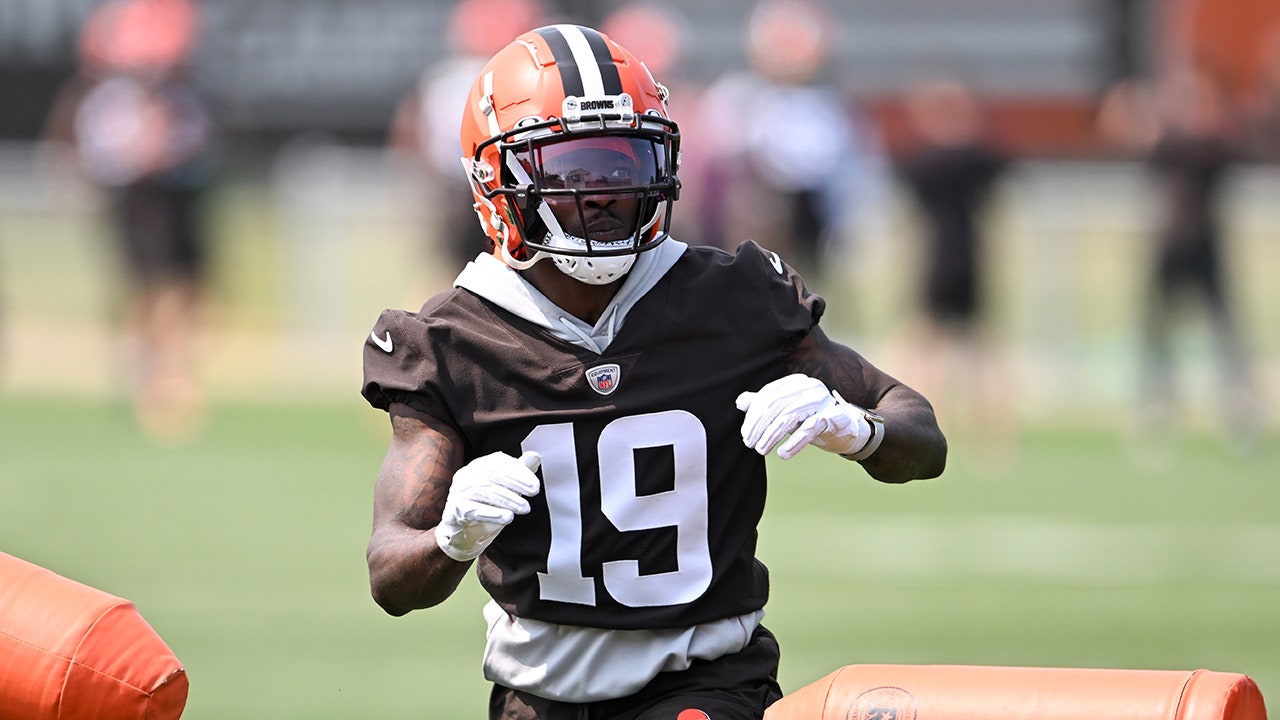 Marquise Goodwin of the Cleveland Browns celebrates a catch during OTAs at CrossCountry Mortgage Campus May 31, 2023, in Berea, Ohio. (Nick Cammett/Diamond Images via Getty Images)