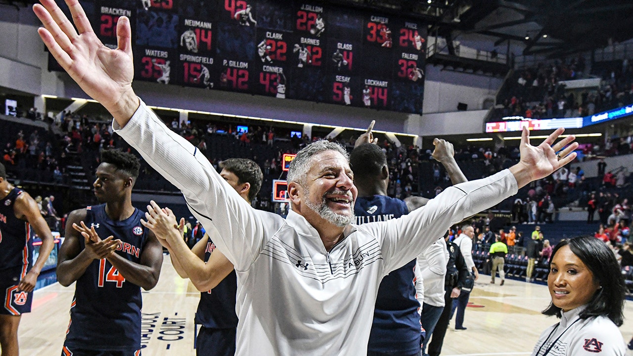 Auburn head coach Bruce Pearl celebrates a win over Mississippi after an NCAA college basketball game in Oxford, Miss., Saturday, Jan. 15, 2022. (AP Photo/Bruce Newman)