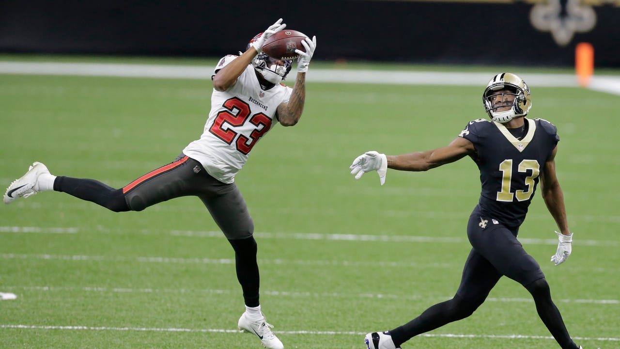 Tampa Bay Buccaneers cornerback Sean Murphy-Bunting (23) intercepts a pass intended for New Orleans Saints wide receiver Michael Thomas (13) during the first half of an NFL divisional round playoff football game, Sunday, Jan. 17, 2021, in New Orleans. (AP Photo/Brett Duke)