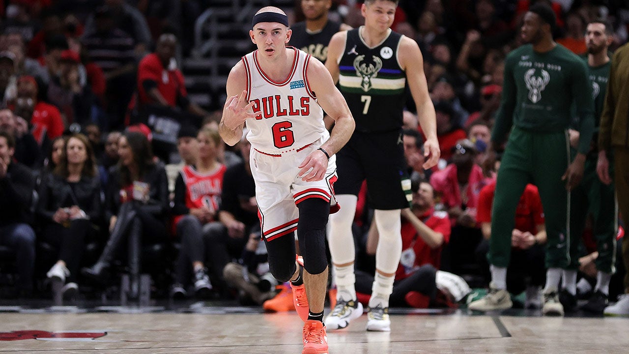 Alex Caruso #6 of the Chicago Bulls reacts to a three point shot during the second quarter of Game Three of the Eastern Conference First Round Playoffs against the Milwaukee Bucks at the United Center on April 22, 2022 in Chicago, Illinois. (Stacy Revere/Getty Images)