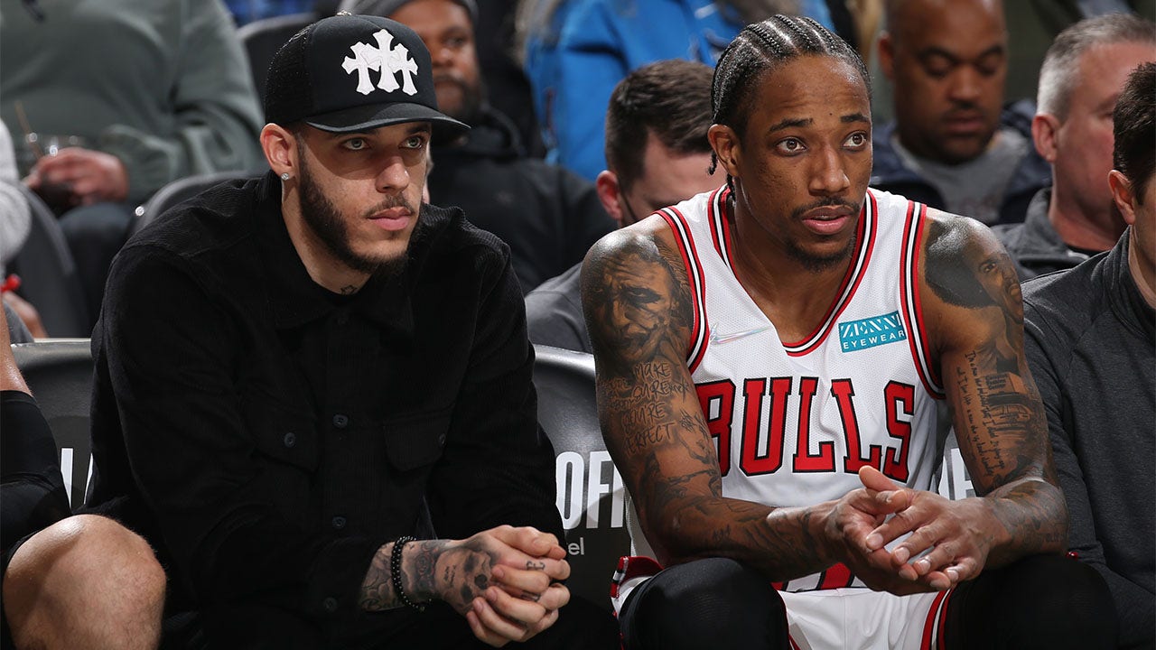 Lonzo Ball, #2, and DeMar DeRozan, #11 of the Chicago Bulls, look on during Round 1 Game 5 of the 2022 NBA Playoffs on April 27, 2022, at the Fiserv Forum Center in Milwaukee, Wisconsin. (Gary Dineen/NBAE via Getty Images)