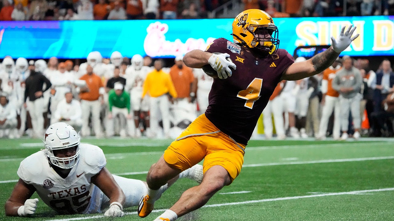 Arizona State running back Cam Skattebo (4) is tackled by Texas linebacker Barryn Sorrell (88) during the first quarter of the Chick-fil-A Peach Bowl in Atlanta Wednesday, Jan. 1, 2025. (Imagn)
