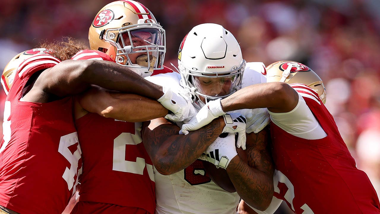 James Conner of the Arizona Cardinals is tackled by multiple members of the San Francisco 49ers defense at Levi's Stadium on Oct. 1, 2023, in Santa Clara, California. (Ezra Shaw/Getty Images)