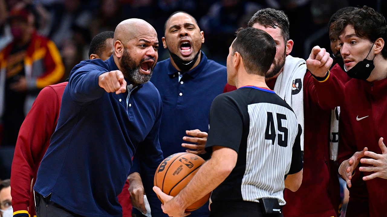 Head coach J.B. Bickerstaff and the Cleveland Cavaliers bench have words with crew chief Brian Forte after a foul was called against the team during the second half of its game against the Charlotte Hornets at Spectrum Center Feb. 4, 2022, in Charlotte, N.C. The Cavs won 102-101. (Grant Halverson/Getty Images)