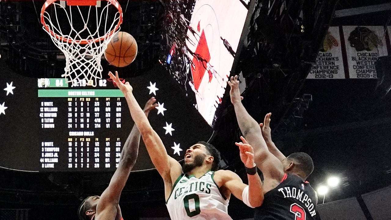 Boston Celtics forward Jayson Tatum (0) drives to the basket against Chicago Bulls forward Patrick Williams, left, and center Tristan Thompson during the second half of an NBA basketball game in Chicago, Wednesday, April 6, 2022. The Celtics won 117-94. (AP Photo/Nam Y. Huh)