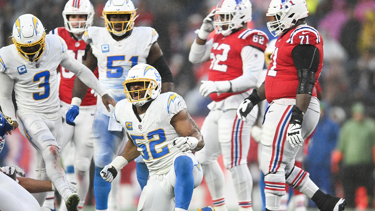 Khalil Mack #52 of the Los Angeles Chargers celebrates after a defensive stop during the second half against the New England Patriots at Gillette Stadium on December 3, 2023 in Foxboro, Massachusetts. (Kathryn Riley/Getty Images)