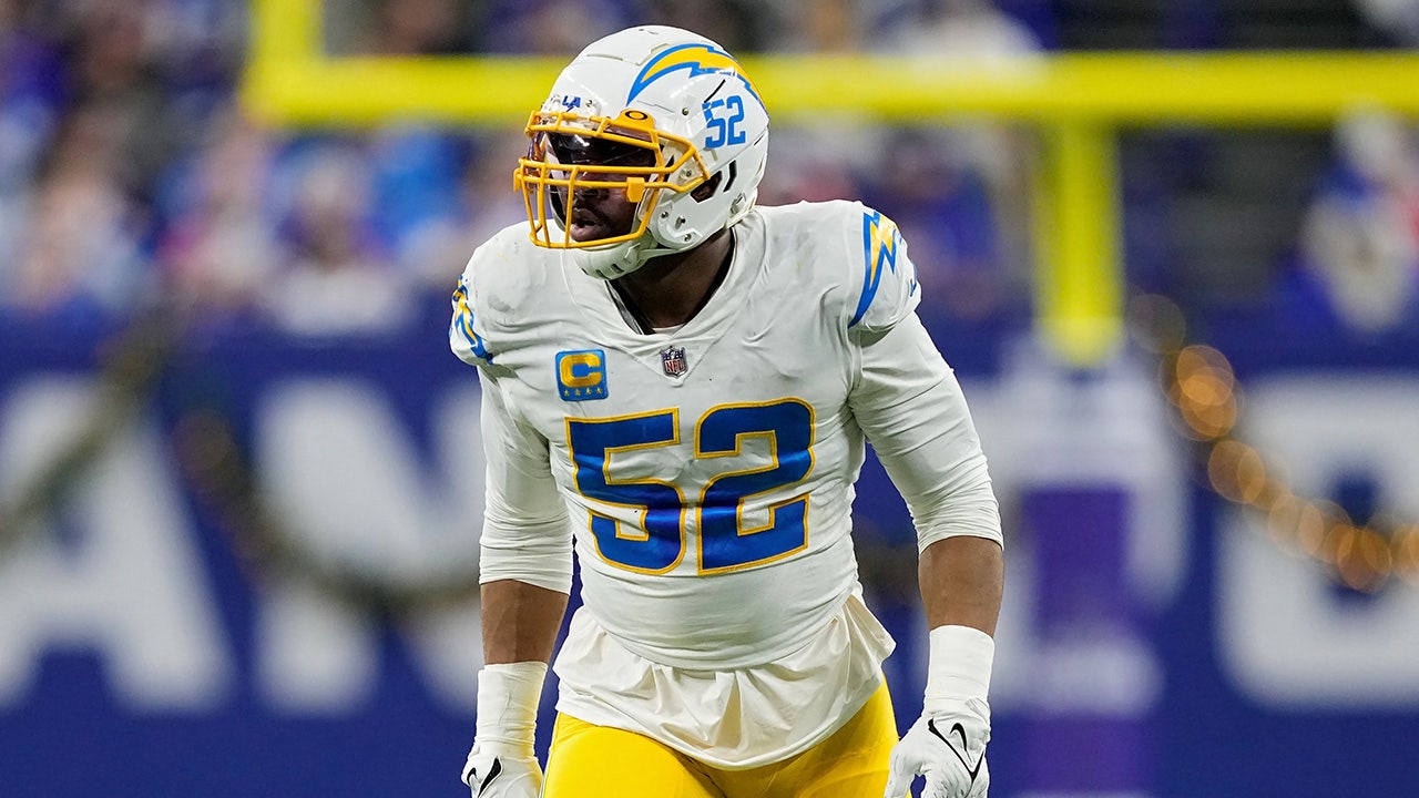 Khalil Mack of the Los Angeles Chargers lines up for a play against the Colts at Lucas Oil Stadium on Dec. 26, 2022, in Indianapolis. (Dylan Buell/Getty Images)