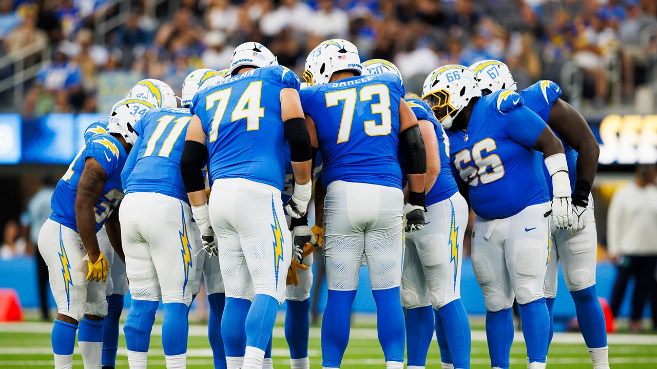 Los Angeles Chargers offensive unit group huddle during a preseason game against the Los Angeles Rams at SoFi Stadium on August 17, 2024, in Inglewood, California. (Ric Tapia/Getty Images)