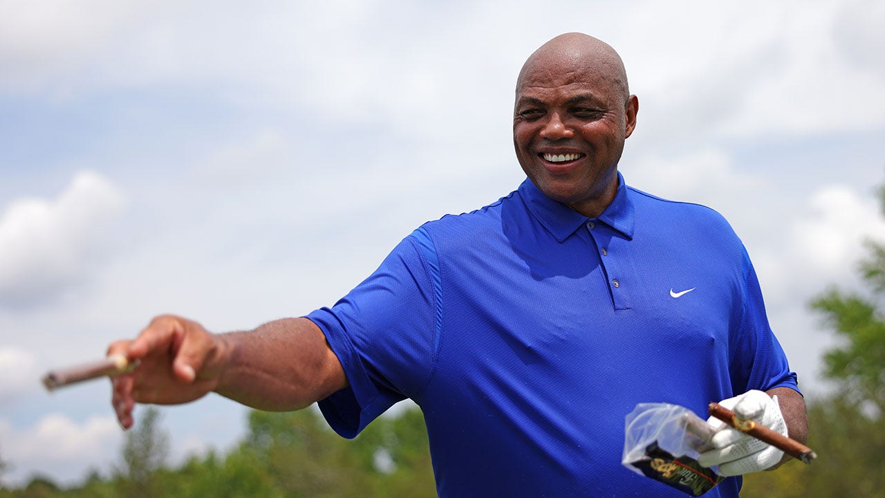 Charles Barkley with cigars on the seventh hole during the pro-am prior to the LIV Golf Invitational - Bedminster at Trump National Golf Club in Bedminster, New Jersey, on July 28, 2022. (Chris Trotman/LIV Golf via Getty Images)