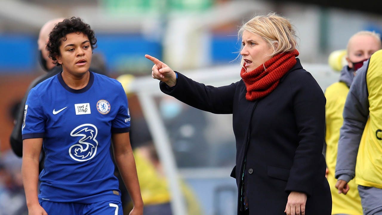 Emma Hayes, manager of Chelsea, gives instructions during the Barclays FA Women's Super League match against Aston Villa Women at Kingsmeadow on March 28, 2021 in Kingston upon Thames, England. (Catherine Ivill - The FA/The FA via Getty Images)