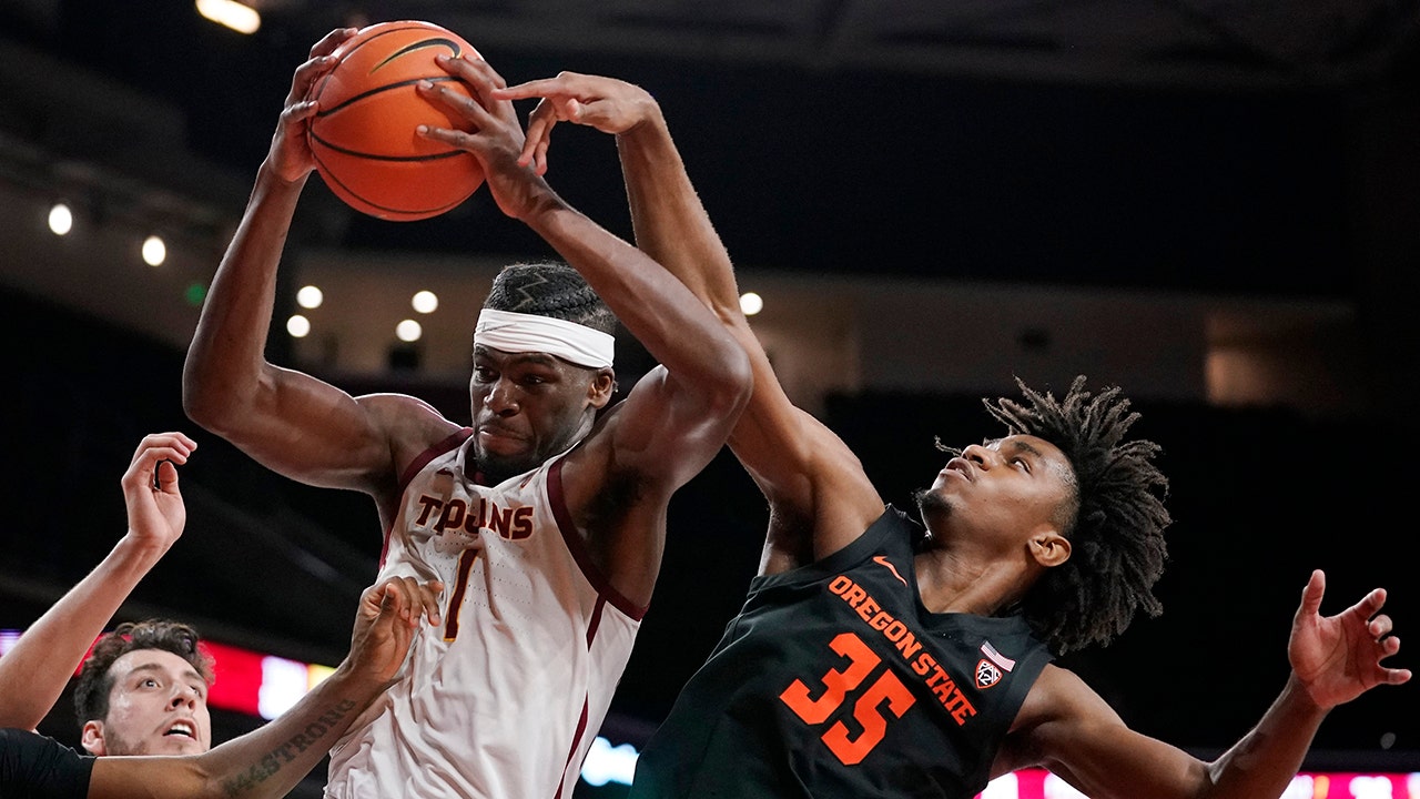 Southern California forward Chevez Goodwin, left, grabs a rebound away from Oregon State forward Glenn Taylor Jr. during the second half of an NCAA college basketball game Thursday, Jan. 13, 2022, in Los Angeles. (AP Photo/Mark J. Terrill)