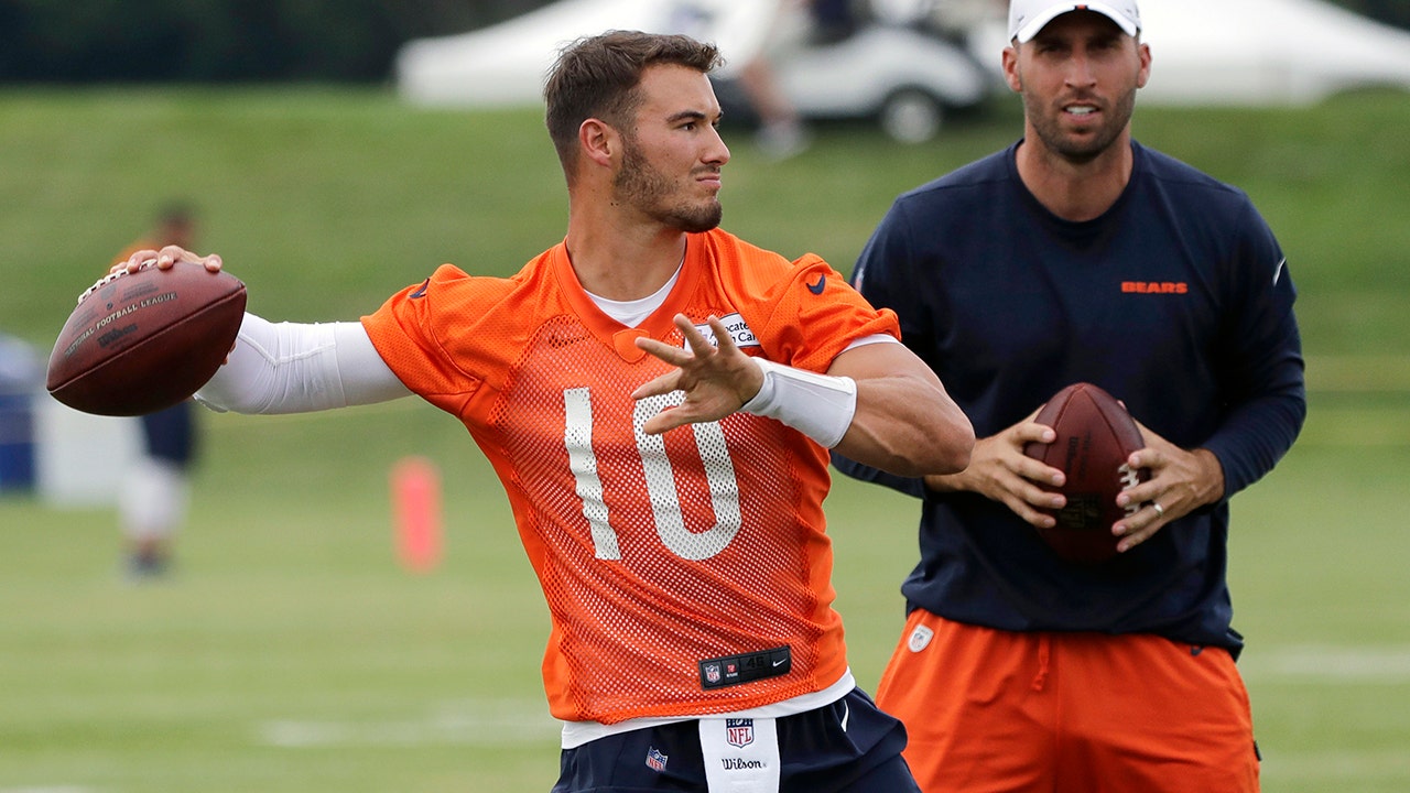Chicago Bears quarterback Mitchell Trubisky throws a ball as quarterbacks coach Dave Ragone looks on during an NFL football training camp on July 26, 2019, in Bourbonnais, Ill. (AP Photo/Nam Y. Huh, File)