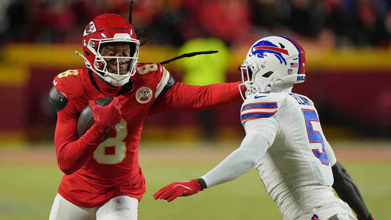 Chiefs wide receiver DeAndre Hopkins runs with the ball past Buffalo Bills cornerback Kaiir Elam during the AFC Championship game, Sunday, Jan. 26, 2025, in Kansas City. (AP Photo/Charlie Riedel)
