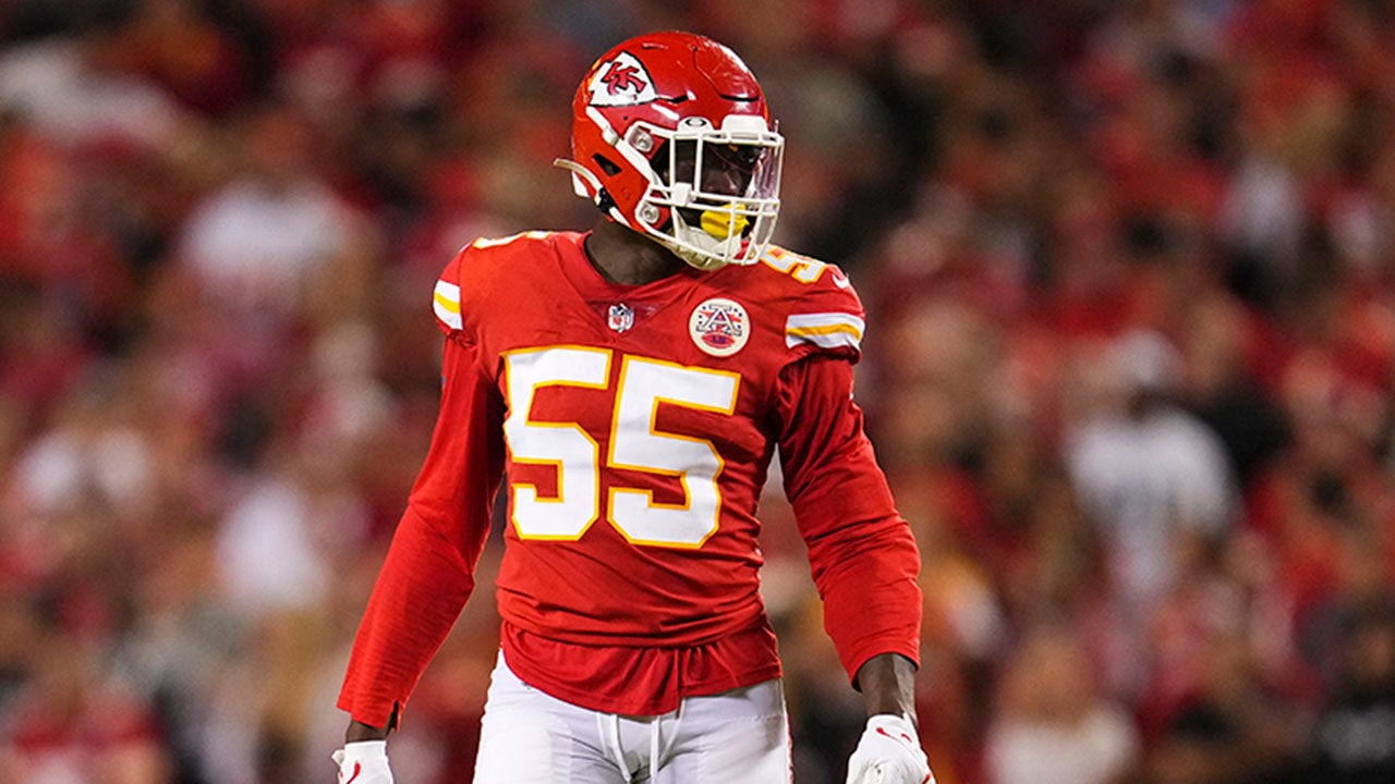 Frank Clark #55 of the Kansas City Chiefs looks down field against the Las Vegas Raiders at GEHA Field at Arrowhead Stadium on October 10, 2022 in Kansas City, Missouri. (Cooper Neill/Getty Images)