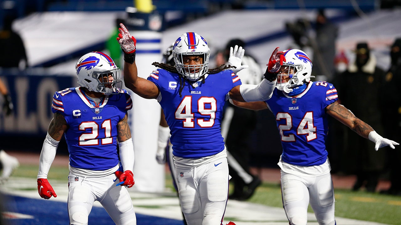 Buffalo Bills middle linebacker Tremaine Edmunds (49) celebrates with Jordan Poyer (21) and Taron Johnson (24) during the second half of an NFL divisional round football game Saturday, Jan. 16, 2021, in Orchard Park, N.Y. The Bills won 17-3. (AP Photo/John Munson)