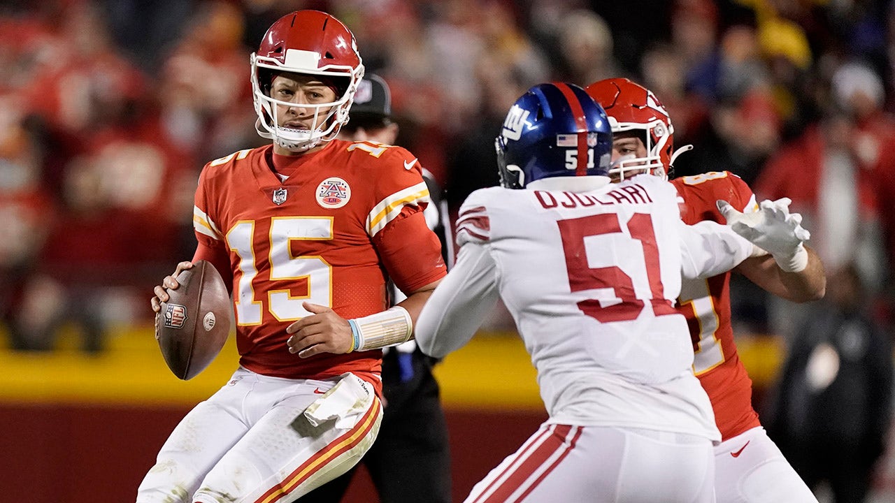 Kansas City Chiefs quarterback Patrick Mahomes (15) looks to throw under pressure from New York Giants linebacker Azeez Ojulari (51) during the second half of an NFL football game Monday, Nov. 1, 2021, in Kansas City, Mo. (AP Photo/Charlie Riedel)