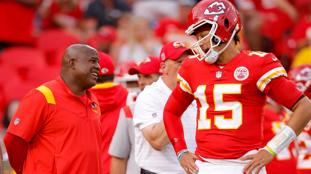 Kansas City Chiefs offensive coordinator Eric Bieniemy speaks with Patrick Mahomes #15 of the Kansas City Chiefs during pregame warmups prior to the game against the Los Angeles Chargers at Arrowhead Stadium on Sept. 15, 2022 in Kansas City, Missouri. (David Eulitt/Getty Images)