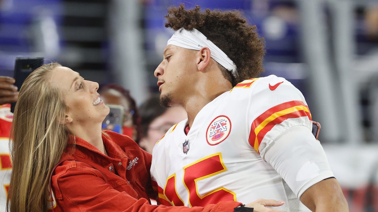 Patrick Mahomes #15 of the Kansas City Chiefs greets his fiance Brittany Matthews prior to the game against the Baltimore Ravens at M&T Bank Stadium on September 19, 2021 in Baltimore, Maryland. (Rob Carr/Getty Images)